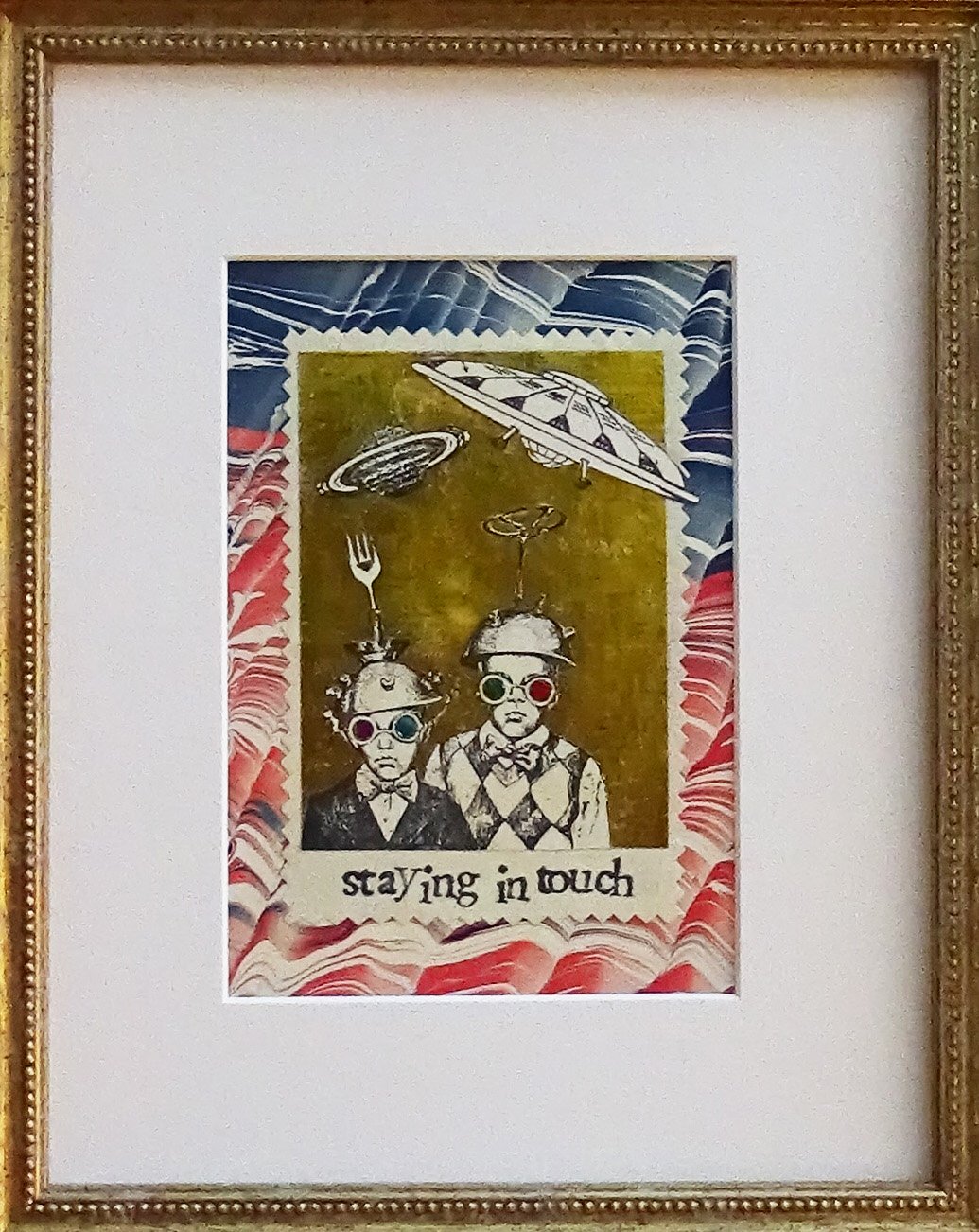 Collage mounted onto hand marbled paper. Framed. Image H 16.5 cm x W 11.5 cm. Framed H 27 cm x W 22 cm.